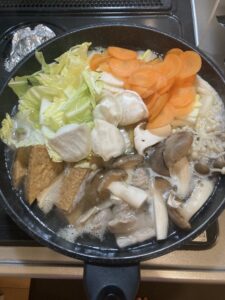 お鍋(鶏モモ・白菜・人参・玉ねぎ・しめじ・エノキ・エリンギ・結びこんにゃく・厚揚げ・水餃子)