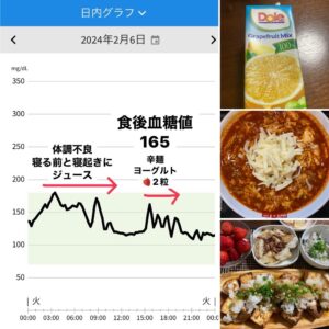 昨日の夕方から体調不良で下痢と嘔吐がありました。寝る前にジュースを飲んだためか夜中に180㎎/dLまで血糖値が上がっていました。夜中にここまで血糖値が上がったのは、計測してから初めてです。